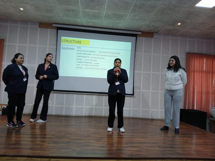 The programme began with a formal welcome, followed by an introduction of the resource person by Ms. Jyoti Sharma, Incharge, Placement Committee. Mrs. Kohli delivered an insightful and engaging session on crafting impactful résumés and mastering interview techniques. She emphasised the art of effective self-introduction, key components of a strong résumé, and strategies for confidently handling frequently asked interview questions. She highlighted the importance of clarity, body language, and presenting achievements, skills, and strengths convincingly to prospective employers. Practical guidance on structuring résumés, aligning career goals, and showcasing personality and potential was also shared.