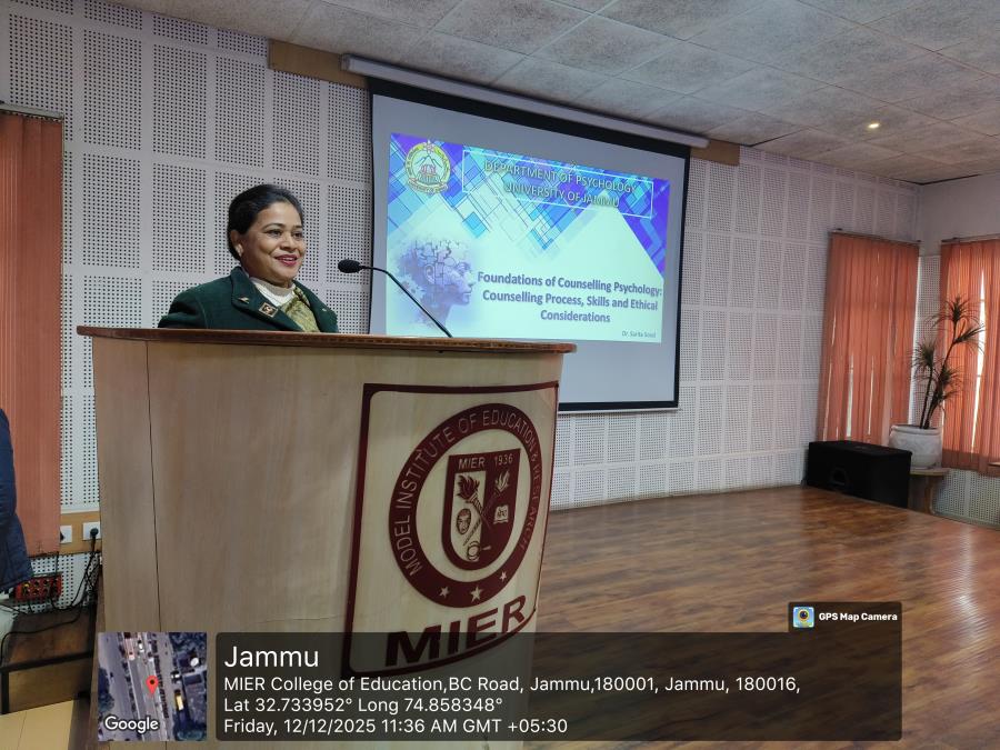 The session, aligned with the prescribed curriculum, was conducted by Dr. Sarita Sood, Senior Assistant Professor in the Department of Psychology at the University of Jammu. An esteemed alumna of the B.Ed. cohort of 2001 at MIER College of Education, Dr. Sood shared her extensive academic and professional expertise, offering valuable insights into the fundamentals of counselling psychology.